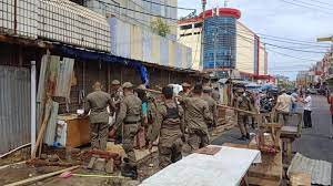 MAKASSAR – Patroli Kendaraan Roda Dua (PARONDA) Tim khusus Satpol PP Makassar bersama instansi terkait melakukan penertiban lapak PK5 di pasar Sentral Wilayah Kecamatan Wajo, Rabu (30/11/2022).